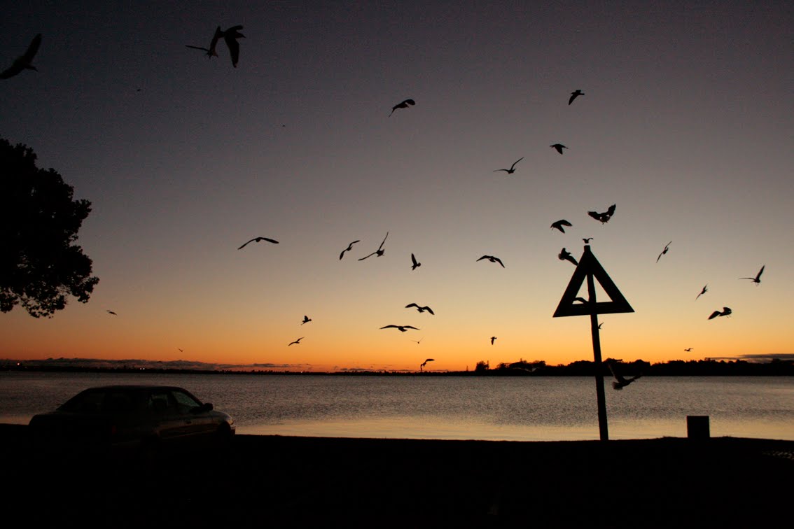 This morning, as soon as it was light enough to fly (6.50am) a hoard of gulls descended en mass on the waterfront at the park. Perhaps they know it's Sunday and there are always good fast-food pickings from Saturday night car-parkers. Or maybe they do it every morning. Within minutes these scavengers had done their clean-up and were gone. It was like a scene from a Hitchcock movie.